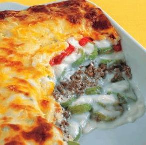 ضعي كميه من البشاميل في صينية الفرن, وضعي نصف كميه الكوسا وأضيفي إليها اللحم المفروم,ثم أضيفي الجزء المتبقي من الكوسا وضعي بقيه البشاميل