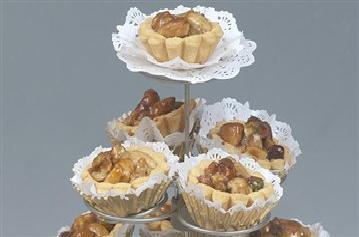 ثم يفرد في صواني التارت الفردية الصغيرة، ويحشى بحشو المكسرات ويوضع في الفرن المسخن 350 درجة تقريباً لمدة من 25 إلى 30 دقيقة حسب الفرن إلى أن يحمر ويكتسب لوناً ذهبياً جميلاً