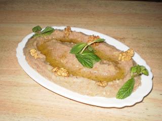 يسكب في طبق التقديم ويسقى بزيت الزيتون. يزين بالنعناع الأخضر والجوز