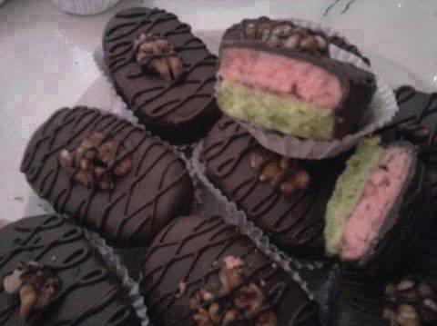 نقسم العجين إلى إثنين واحده نلونها باللون الوردي المعطر في عطر الفريز والتانية باللون الأخضر المعطر بعطر الفستق ونجمع الخليط بالطحين والباكينج باودر حتى نحصل على عجينة طرية نفردها بالحلال ونقطع بالشكل يلي تحبيه نضعها في فرن تم نلصقها بالمربى ونغلفها بالشوكولا الذايبة ونزينها