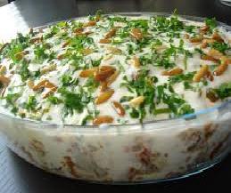 يوضع الحمص المطحون كطبقة أخيرة ثم يضاف الدجاج فوقه