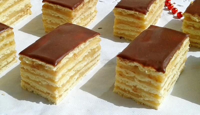 توضع قطع البسكويت المخبوزة فوق بعضها مع إضافة الكريمة بين الطبقات