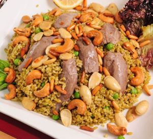 نضع الفريك في طبق التقديم وعليه المكسرات واللحمة وتقدم