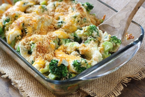 ضعي مزيج الحليب والجبن على البروكلي في صينية قابلة للفرن ثم قلبي