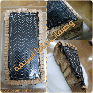 تغمس كل حبة بسكويت بالحليب وتدهن بالكريمة جيدا وتصف واحدة تلو الأخرى حتى يتشكل لدينا صف من البسكويت ثم نضع بجانبه صفا ثانيا وبنفس الطريقة حتى يصبح لدينا قالب بشكل مستطيل
