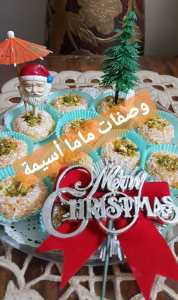 يقطع مربعات أو يكور حسب الرغبة ويغمس في جوز الهند ويرش بالفستق