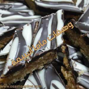 نذيب الشوكولا السوداء وندهن بها وجه الخليط ثم نضعها بالثلاجة ونتركها حتى تبرد ثم نقلبها ونضع عليها الشوكولا السوداء ونكون قد ذوبنا الشوكولا البيضاء نضعها في كيس ونمرر خطوط بالشوكولا ونزخرفها بطرف سكين نتركها حتى تبرد ثم نقطعها مربعات أو معينات