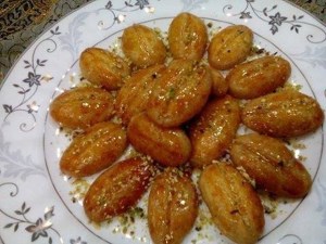 ادهني صينية فرن بالسمن. وقسمي العجينة إلى كور صغيرة بحجم حبة الجوزة، واضغطي في وسطها ضغطة خفيفة بالشوكة، ورصيها على مسافات متباعدة حتى لاتلتصق