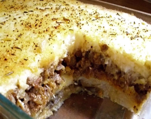 احضرى قالب عميق وادهنيه بالزبدة و يبطن بالبقسماط قومى بوضع طبقة من البطاطا و يسوى السطح باليد المبللة بالماء ثم ضعى فوقها طبقه لحمة مفرومة وضعى طبقة أخرى من البطاطا ويضغط عليها بيد مبللة