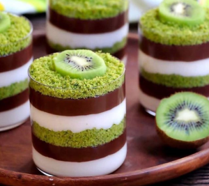 ونخلط الجميع بالخلاط جيداً ثم نصب ½ كمية الخليط في الاكواب على الخليط الابيض ويبرد قليلاً