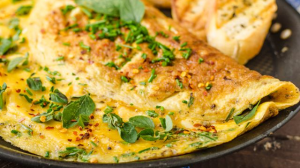 سخّني القليل من زيت الزيتون في مقلاة غير لاصقة على حرارة متوسطة. اضيفي ربع كمية مزيج البيض وافرديها بالتساوي في قعر المقلاة. أطهي الأومليت لدقيقة من كلّ جهة حتى تنضج
