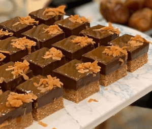 تقطع مكعبات صغيرة وتزين بالكراميل وجوز الهند
