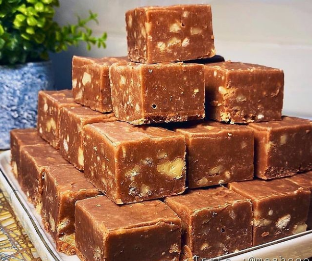 نضع الخليط في صينيه مقاس ٢٠ × ٢٠ مبطنة بورق الزبدة وندخله الثلاجة حتى يبرد