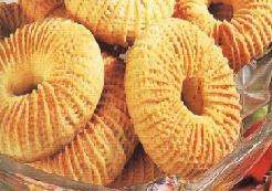نصنع عيدان كبيرة من العجين نفتحها من الوسط ونضع عيدان التمر ثم نغلقها ونصنع دوائر، ثم نقوم بنقشها ونضعها في فرن مسخن مسبقا على درجة حرارة متوسطة حتى تنضج