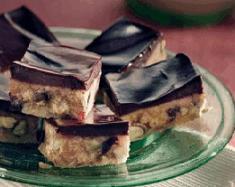 يُقَطَّع قالب البسكويت والشوكولا إلى شرائح صغيرة ثم يُقَدَّم