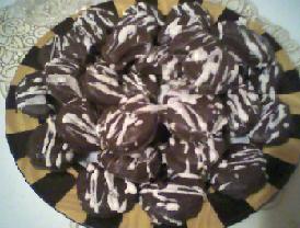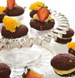 يُوضع جزء من الكريمة على سطح البسكويت (السطح الملامس لقاع الصاج) وتُلصق عليها حبة أخرى من البسكويت(مع الضغط الخفيف ) وتكرر العملية مع باقي الكمية أو توضع الكريمة على سطح البسكويت وتُرص فوقها شرائح الفاكهة