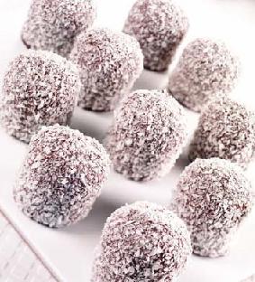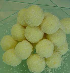 تُقرّص العجينة إلى كرات صغيرة وتُغمس كلّ كرة في جوز الهند وتُقدّم