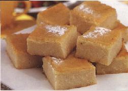 تزين الحلوى باللوز المطحون أو بجوز الهند وتترك لعدة ساعات ثم تقطع إلى مربعات