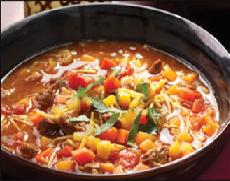 يوضع الماء ومعجون الطماطم ومغلف شوربة خضار في قدرٍ كبير
