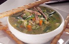 يرفع لحم الدجاج من القدر ويفتت، ثم يعاد إلى الحساء