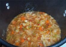 تضاف هريسة العدس إلى المزيج أعلاه وتعاد القدر إلى النار ويطهى محتواها لمدة 8 إلى 10 دقائق مع التحريك بين الحين والآخر