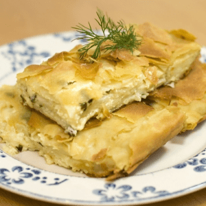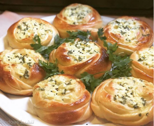تخلط الجبنة وزيت الزيتون والبقدونس والملح والفلفل وتوضع جانبا. ثم تؤخذ 4 قطع من العجينة وتوضع في الصينية وتدهن بمزيج الزبدة والزيت ثم تؤخذ أربع قطع أخرى وتوضع فوق الأخرى وتدهن بالزبدة ثم تحشى بخليط الجبن