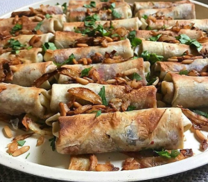 توضع 4 قطع من العجينة وتدهن بخليط الزبدة ثم تكرر العملية مرة أخرى مع 4 قطع من العجينة ثم تزال الحواف الفائضة من العجينة. وتقطع الى قطع مربعة بحيث لا تصل السكينة الى قعر الصينية