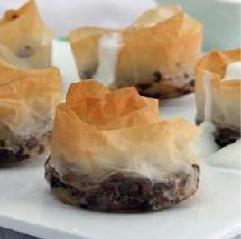 تقطع كل رقاقة فايلو إلى قسمين متساويين، ثم يطوى كل نصف ويحشى بمقدار ملعقة أو ملعقتيّ طعام من خليط اللحم