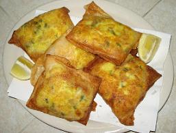 نضع زيت زيتون في وعاء صغير ونغمس كرة العجين في الزيت ثم نفرد كرة العجينة ونضع كمية ملعقة كبيرة من الحشوة ثم تطوى العجينة على شكل مثلث ثم توضع الفطائر في صينية الفرن مدهونة بقليل من الزيت