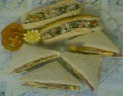 يحشى التوست بشكل طبقات بالحشوة الثانية كطبقات ثم تقطع حواف التوست وتقطع على شكل مثلثات