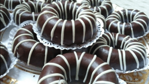 ثم في فرن متوسط الحرارة نضعها عشر دقائق، ونطفى الفرن من الأسفل، ونشعل من فوق، ونراعيها حتى لا تحترق، ثم نزينها بالشوكولا البنية والبيضاء