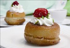 تزين قطع البابا المحشوة بالكريمة المخفوقة والفراولة والفستق الحلبي وتحفظ في الثلاجة