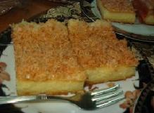 وبعد إخراج الكعكة من الفرن مباشرة نضع عليها خليط الزبدة والحليب، ثم نحمص جوز الهند على النار حتى يحمر لونه ونرشه فوق الزبدة والحليب وتترك الكعكة حتى تبرد ثم تقطع وتقدم