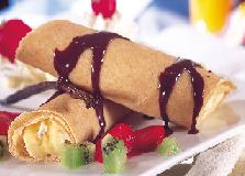 تبسط القشدة فوق كل قطعة كريب، ومن ثم شرائح الموز أو أي نوع آخر من الفاكهة، تلف بعدها قطع الكريب وتقدم مع صلصة الشوكولا والمزيد من الفاكهة