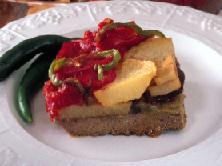 ترصف قطع الباذنجان المقلية فوق لحم الكفتة، ثم توضع فوقها شرائح البطاطا، تسكب صلصة البندورة فوق البطاطا وترصف فوقها شرائح البندورة، والفلفل الأخضر، والفلفل الحريف في حال استعماله